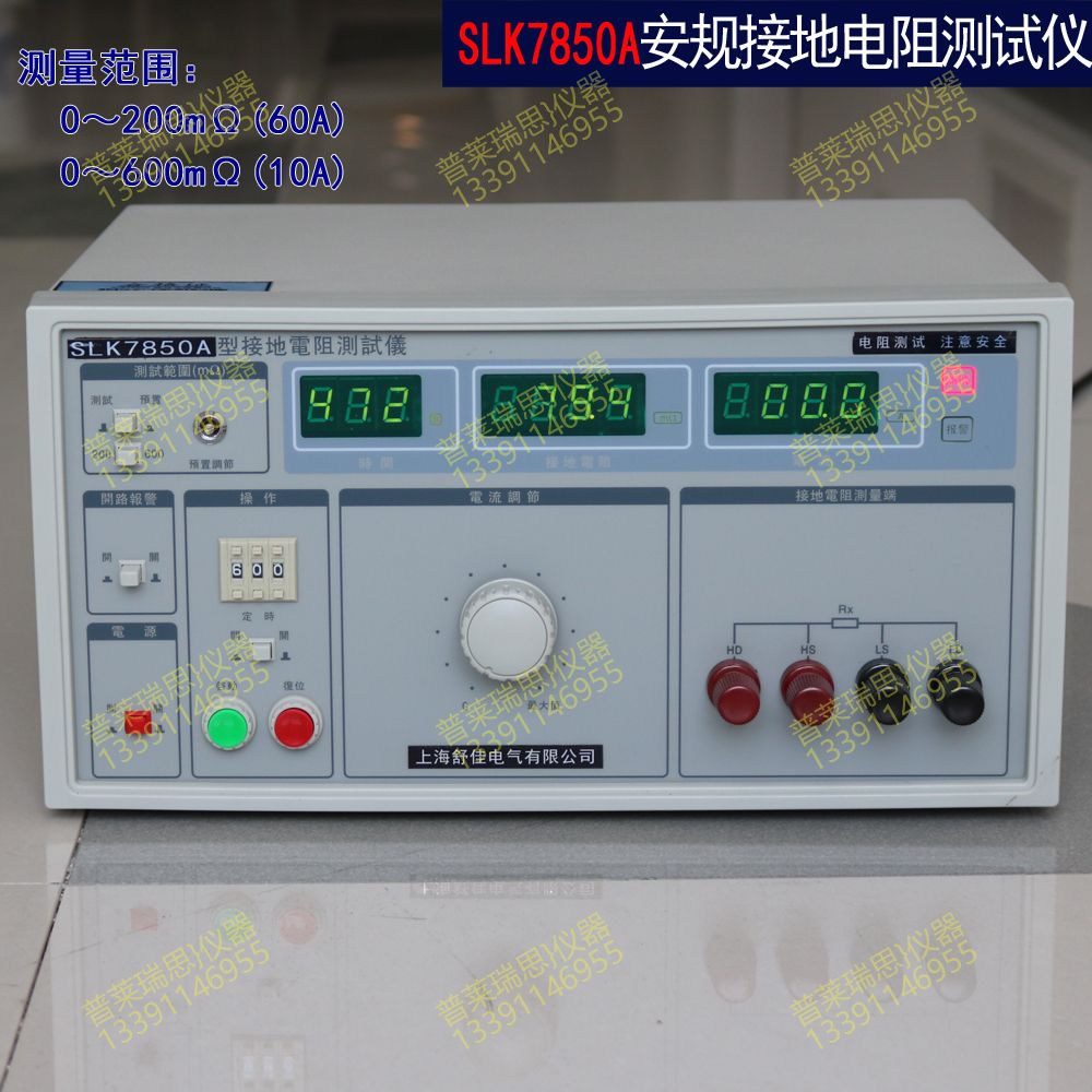 SLK7850A 系列接地电阻测试仪是按照 GB﹑IEC﹑ISO﹑BS﹑UL﹑JIS 等国际国内的安全标准而设计的,接地电阻的指标是衡量各种电气设备安全性能的重要指标之一。它是在大电流(25A 或 10A)的情况下对接地回路的电阻进行测量,同时也是对接地回路承受大电流指标的测试,以避免在绝缘性能下降(或损坏)时对人身的伤害。本测试仪是为满足以上要求为生产车间及实验部门提供高性能测试仪器而开发生产的。本仪器对供电电压要求不高,测量精度高,速度快,使用方便,特别适用于要求高的实验室和自动检测线上使用。断路报警选择功能(即开路报警)可以方便地知道仪器是否工作在正常测试状态,用户可以根据实际需要选择是否需要此项功能。本仪器采用三位半数字显示, 读数方便,采用优化设计,整机具有极高的可靠性和稳定性。