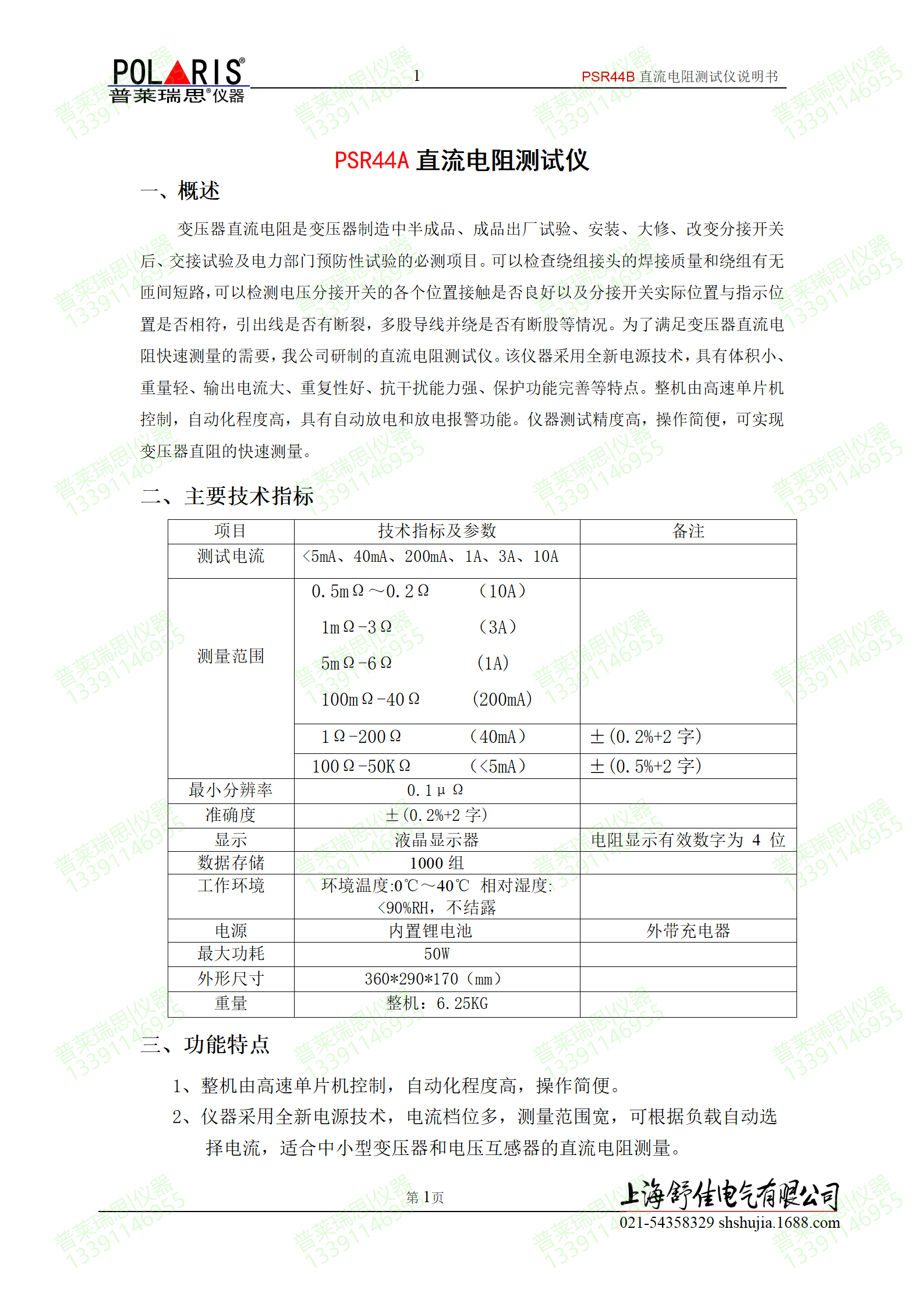 PSR44A 直流电阻测试仪 一、 概述 变压器直流电阻是变压器制造中半成品、成品出厂试验、安装、大修、改变分接开关后、交接试验及电力部门预防性试验的必测项目。可以检查绕组接头
